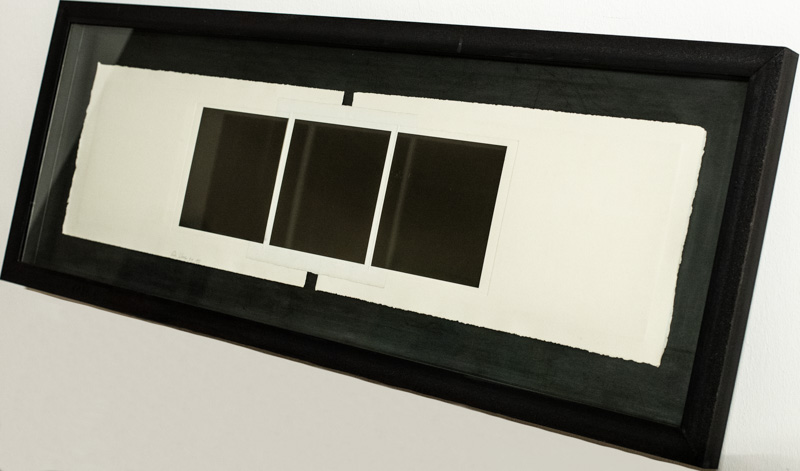 3 Quadrate auf weißem Karton vor schwarz-grauer Stahlplatte; Künstlerrahmung