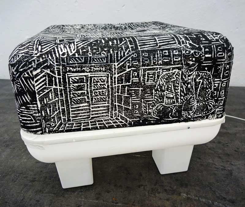 Technik : Leuchtobjekt, Kunststoff, Kartonpappe kaschiert mit Linolcollagen, Handabzug auf Japanpapier